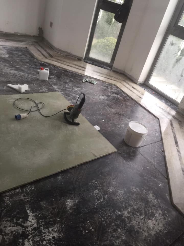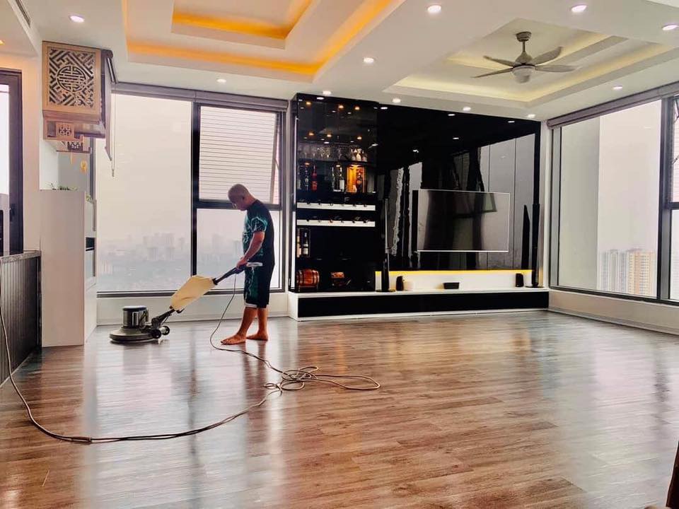 - Làm sạch bụi và vết bẩn trên sàn: Sử dụng máy hút bụi công suất lớn và lau sàn để loại bỏ bụi bẩn và vết bẩn.